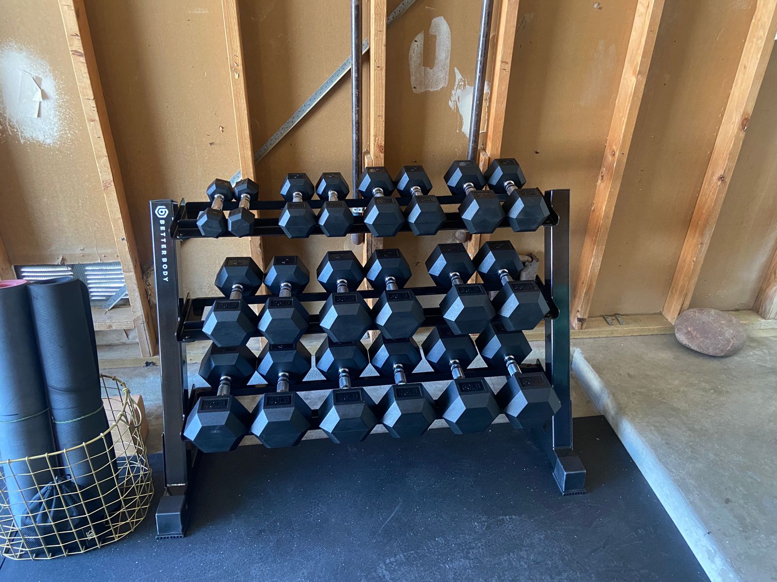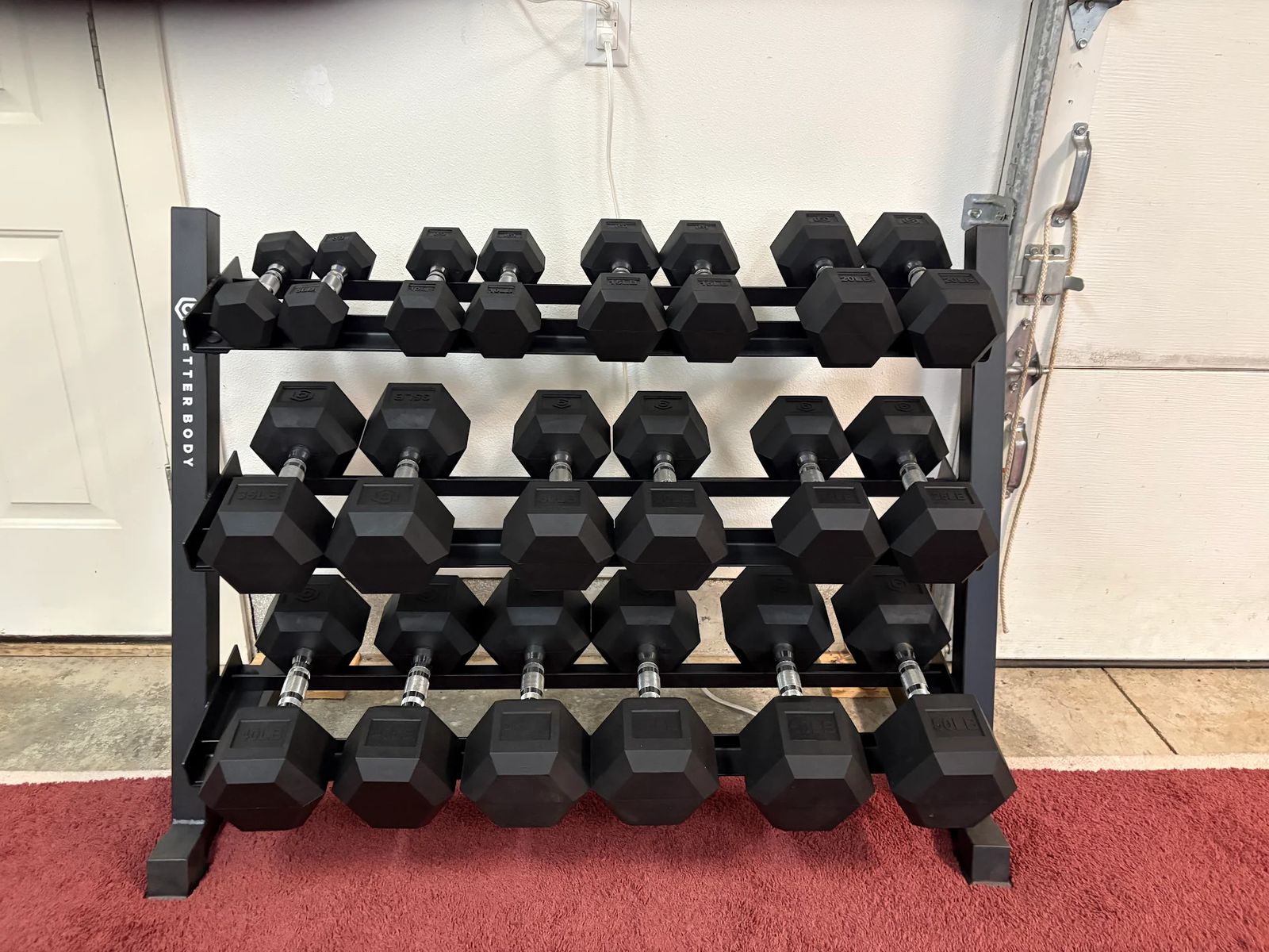 The Better Body Rubber Hex Dumbbell Set and Weight Rack is the ultimate solution for lifters at every level. Whether you’re starting your fitness journey or upgrading from beginner equipment, this set is built for durability, performance, and style. Crafted from all-natural, low-odor rubber, these dumbbells are durable and drop-friendly, designed to handle your toughest workouts without compromising performance. Push yourself to the limit, knowing your equipment can take the impact. And don’t worry about your floors—pair them with our Exercise Mat or Gym Floor Mat for added protection.